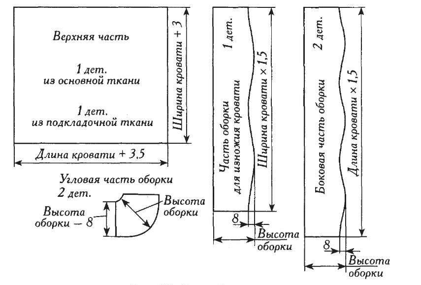 Отдельного подсчета требуют складки, буфы (заломы на ткани). Если планируете подзор, то используете для него отрез, разрезанный по длине, узкий. Измеряйте размер кровати (периметр) и прибавьте 60 – 150% в зависимости от глубины складок и их количества.