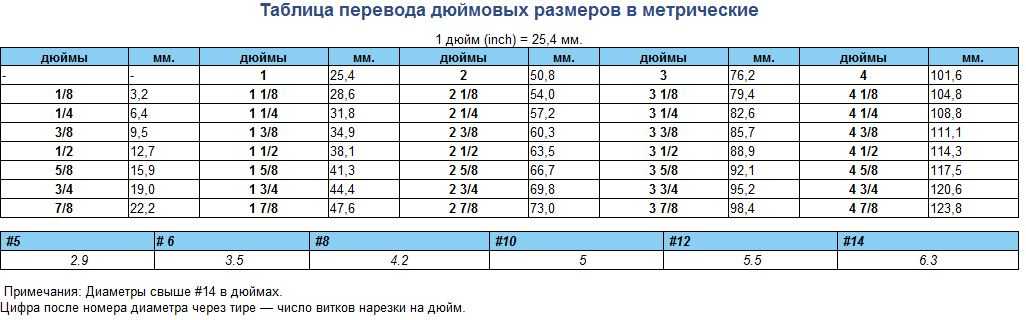 | Размер в дюймах | Размер в миллиметрах | Размер в сантиметрах | Размер в дюймах | Размер в миллиметрах | Размер в сантиметрах |