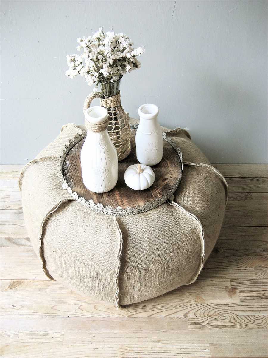 Намного удобнее использовать такой предмет мебели, чтобы присесть за низкий журнальный столик, ведь самодельный пуф можно сделать любой высоты.