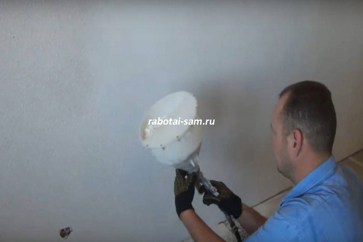 После оклейки стены сразу наносим хлопья. Это сделать можно при помощи пистолета или компрессора. Если данного оборудования не имеется, тогда можно и вручную, но качество будет немного не то, поскольку хлопья должны наноситься под давлением и равномерно, без перерасхода.