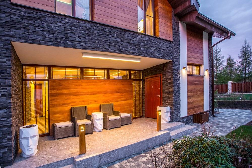 Впечатляет, прежде всего, характеристики материала: влагостойкость, пожаробезопасность, удивительная долговечность, прочность. Декоративная отделка фасада загородного дома керамогранитом требует вложений, но и результат – выше всяческих похвал. Тем более есть возможность выбрать любую форму, цвет. Предлагаются лощеные, матовые, мозаичные, глазурованные и многие другие варианты.