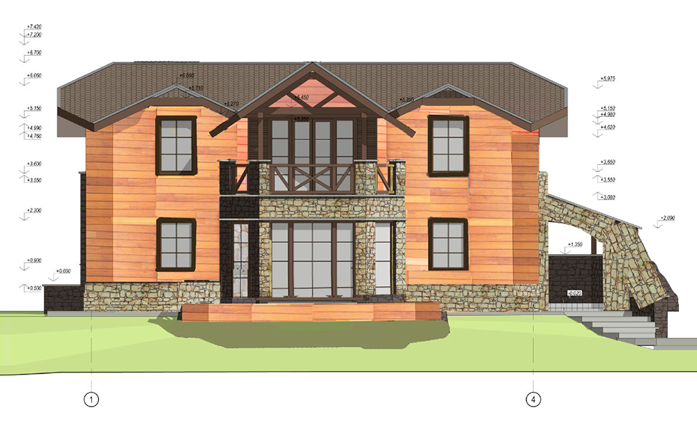 Этот вариант фасада я нарисовал сам в «Фотошопе». Эркер и цоколь отделаны камнем, все остальное — деревянное