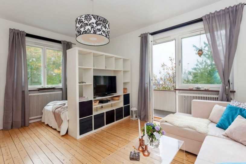 Соответствующая конструкция полностью скрывает обе зоны друг от друга, гарантируя качественное зонирование гостиной и спальни. Причем перегородка может простилаться до середины комнаты или от одной стены до другой, чтобы устроить внутри нее дверь. Для последней рекомендуется выбирать раздвижное или складное полотно.