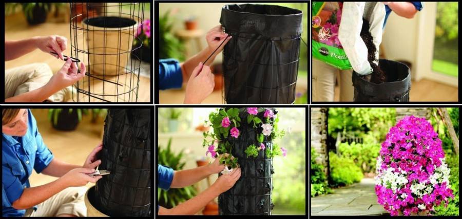 Общий принцип выполнения различных этапов сборки вертикальных клумб схож. Для их изготовления необходимо подготовить основу, обустроить удобный полив, заполнить каркас почвой и посадить подготовленные растения. При изготовлении конструкций из различных материалов имеются определенные тонкости.