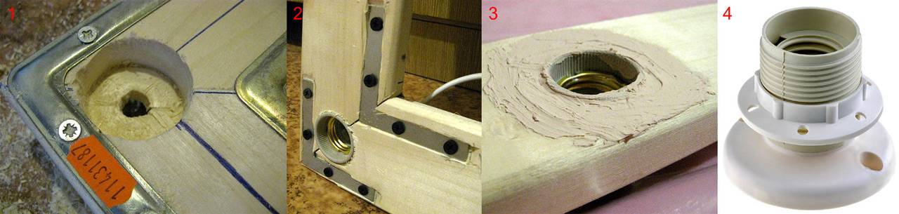 Патрон лампы утапливается в раму частично или полностью, по венчик (поз. 2 на рис.). В том и другом случае лунку (поз. 1) или сквозное отверстие под него нужно сверлить перьевым или корончатым сверлом. С учетом последующей декоративной отделки под стальной крепеж нужно выбирать пазы, а под проводку – канавки. Для чего требуется либо дорогостоящий специнструмент (ручной фрезер по дереву), либо утомительная работа молотком и стамеской. После чего видимые на черновом изделии зазоры нужно зашпаклевать, поз. 3. Если работать в на балконе или в жилой комнате, стружки образуется столько, что будущая счастливая обладательница уж и не рада будет подарку.