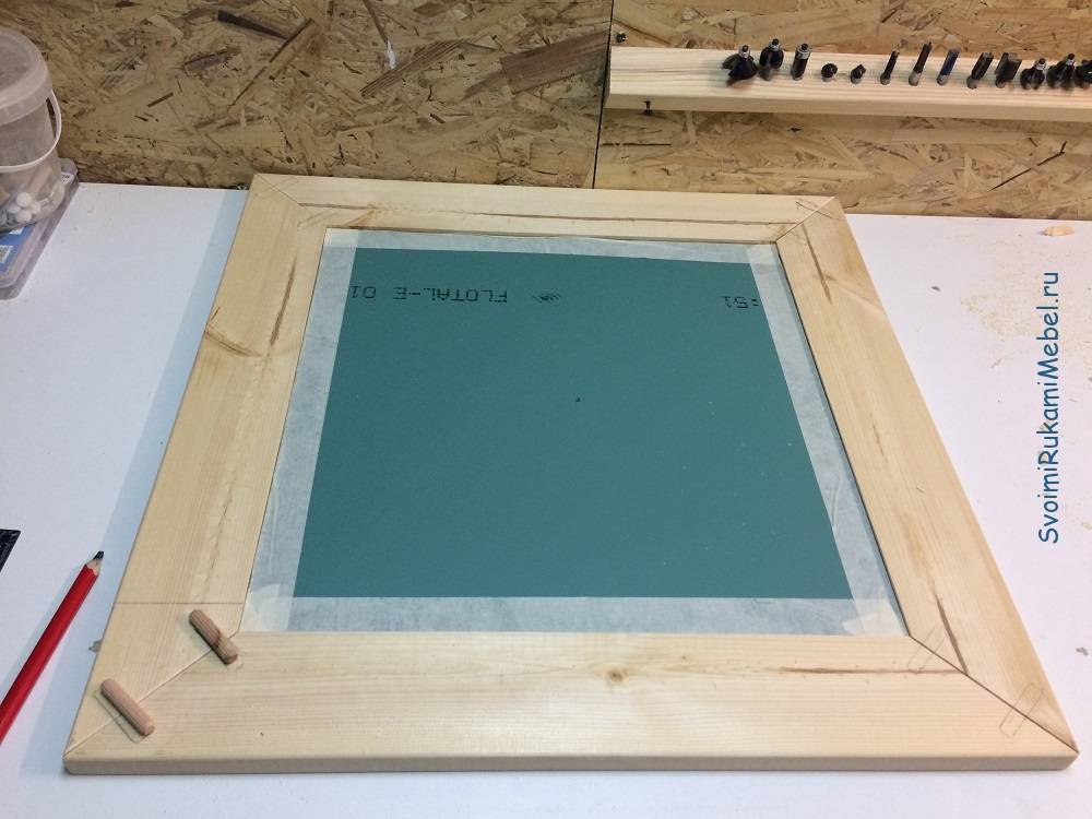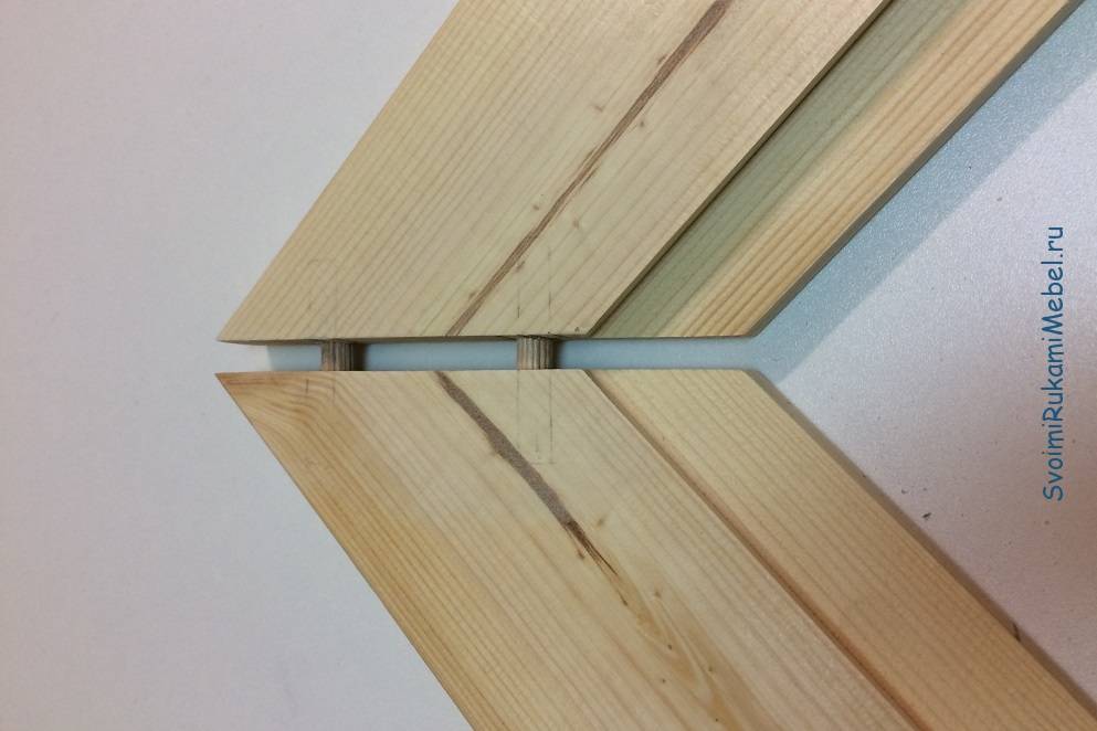 - Достаем все шпунты из отверстий. В каждое из отверстий необходимо налить по несколько капель клея, вставить по 2 шпунта в каждую из деталей. Вкладываем зеркало и заталкиваем все шпунты либо с помощью струбцины, либо с помощью ремня. Для скрепления я не использовал струбцины, так как саму линию соединения я склеивать не стал — рама отлично держалась только на шпунтах.После склейки лучше подождать полного высыхания клея. В зависимости от температуры и влажности воздуха от 4 до 12 часов.