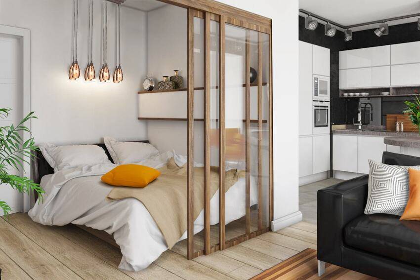 Если в комнате есть ниша достаточного размера, спальню можно разместить прямо в ней. Чаще всего ширины ниши хватает для размещения полноценной кровати. В качестве перегородки хороши стеклянные раздвижные двери, они не только спрячут от посторонних спальню, но и позволят проникать внутрь достаточному количеству естественного света.