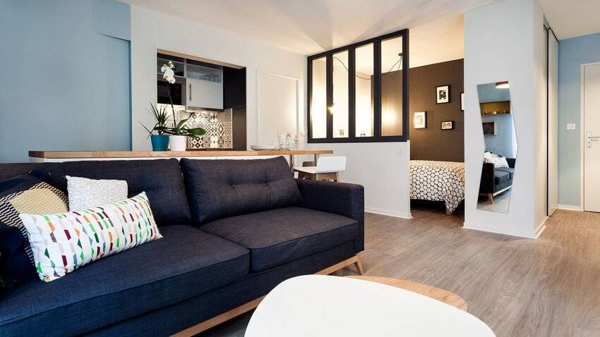 Чаще всего вместо межкомнатных стен используются перегородки: статичные, раздвижные, складные или даже мобильные передвижные. Для изготовления используется гипсокартон, стекло, дерево, текстиль. В сложную каркасную конструкцию можно спрятать систему хранения для вещей, а складные тканевые ширмы привнесут в интерьер японские нотки.