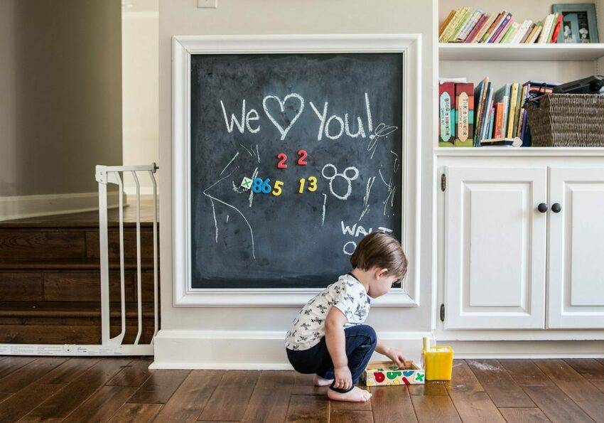При закрашивании под грифель целой стены или ее части ребенок получит идеальное покрытие для творчества и учебы. Малыш не будет испытывать потребности «расписывать» обои в остальной части квартиры, и ремонт уцелеет. Дети более старшего возраста могут применять грифельное покрытие для домашних заданий, изучения таблицы умножения, формул, геометрии.