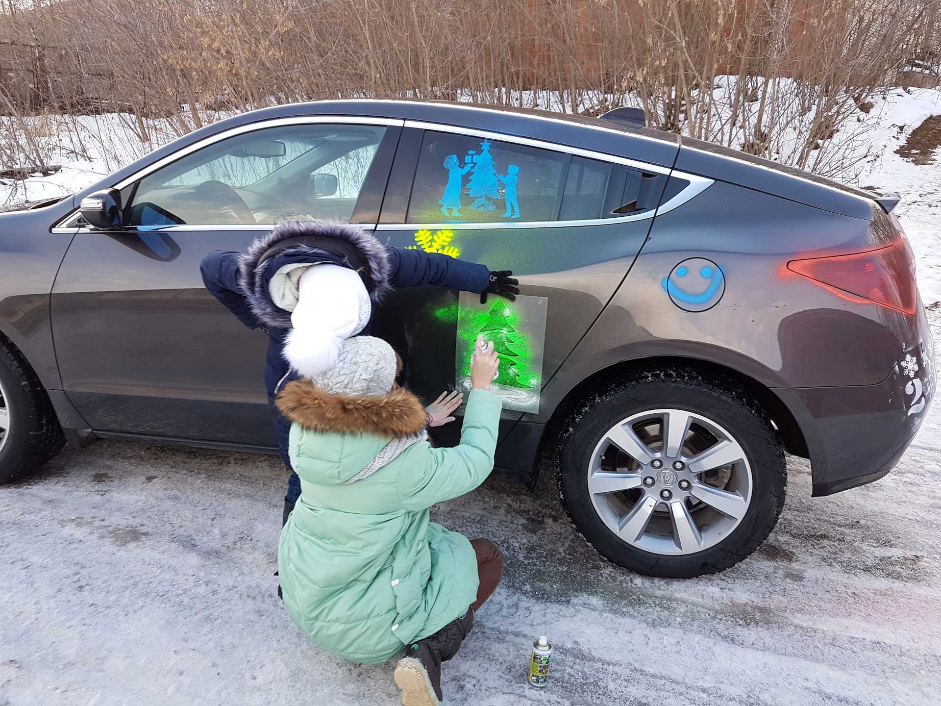При работе с автомобилем все делается еще проще, поверхность должна быть чистой. Для машины лучше выбирать краску в баллончиках. Производят нанесение рисунков или надписей на расстоянии примерно 15-20 сантиметров. В дальнейшем стереть изображение будет легко.