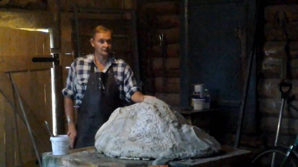 После того, как конструкция затвердела, мы начинаем при помощи ножа делать грани, придавая ей вид камня. После этого разводим в ведёрке цементное молочко, по густоте напоминающее жидкий кефир. Берём для этого 1 часть цемента и 4 части воды. Пропитываем наш искусственный камень цементным молочком при помощи кисти. Затем, после того, как камень подсохнет, наносим сверху ещё цементную массу с песком (цемент — 1 часть, песок — 3 части, врда — 0,5 части).
