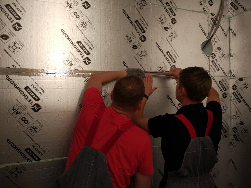 Второй этап — это прямая установка изоляции с помощью пенополиуретанового клея или фасадных анкеров. Разрезать тонкий лист изоляции не сложно с помощью обычного строительного ножа. А чтобы создать монолитный контур барьера для тепла и пара без мостиков холода, достаточно склеить все стыки плит алюминиевой лентой.