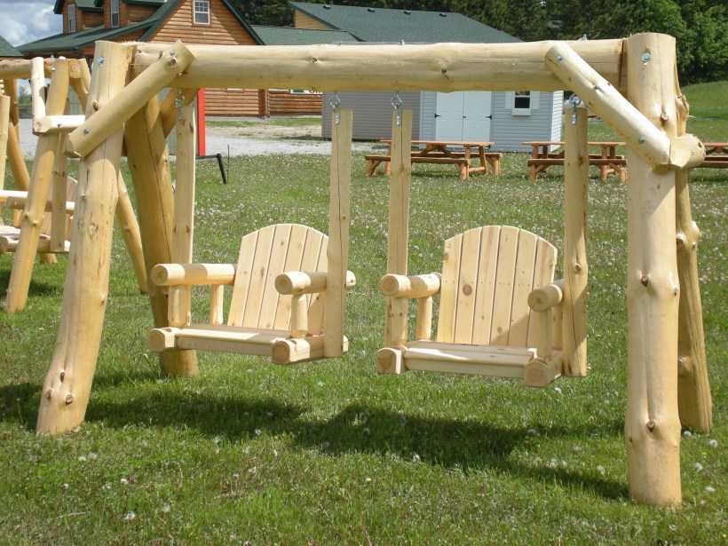 Качели на штанге стабильны, а установка деталей более легкая благодаря правильной форме. Для производства используется цилиндрический или нецилиндрический строительный материал. Стандартный сечение 40 х 70 мм позволит создать вариант с хорошей несущей способностью и диваном-сиденьем. Материал необходимо отшлифовать, обработать фунгицидными и антисептическими растворами. Базовый набор инструментов дополнен скобами, такелажными застежками, цепями.