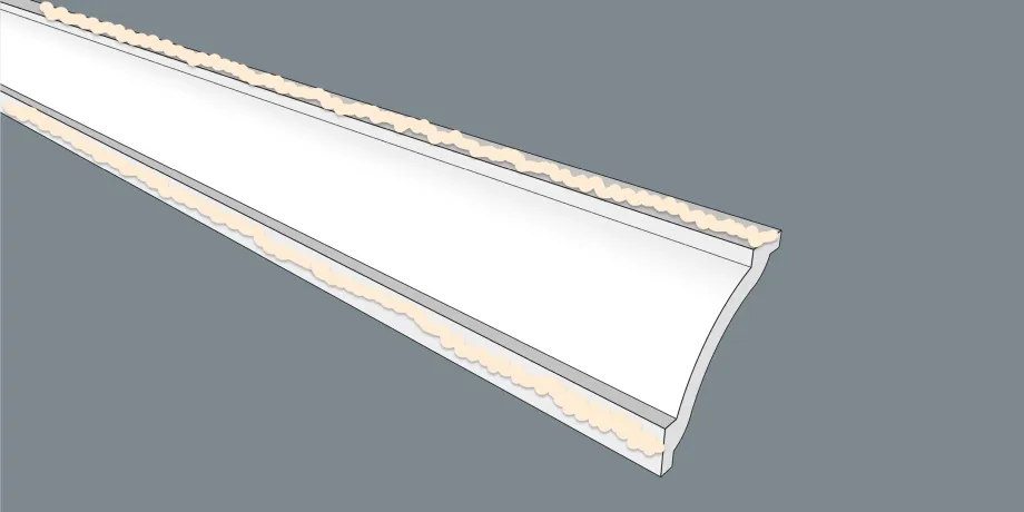 Третий момент – экономия на клеевом составе. Это распространенная ошибка, которая чаще совершается в случае с ровным основанием. Однако, любой слой клея или шпаклевки может стать причиной появления щелей в местах, где они отсутствуют. Так что для исключения этого и для надежности результата стоит наносить фиксирующий раствор по всей протяженности монтажной поверхности. Если речь идет об угловых элементах, то состав должен быть на двух сторонах по всей длине.