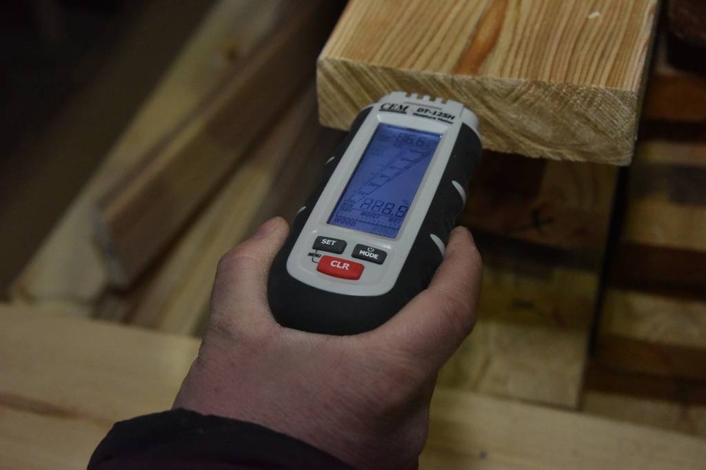 Влажность пиломатериала определяют влагомером. Доска камерной сушки должна иметь показатель 8–12 процентов. Если он выше 20 процентов, такая доска начнёт плесневеть. Фото: Алексей Кунилов
