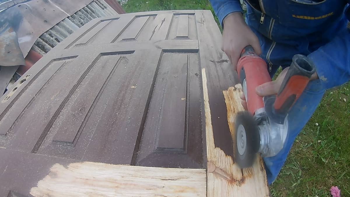 Нанесение финишного покрытия на полотно является финишной стадией реставрации. А проводиться она может только по идеально ровной заготовке, с прямоугольными краями, без выпуклостей и углублений. В первую очередь необходимо подготовить рабочее место. Выполнять манипуляции нужно с дверью в снятом состоянии, уложенной на ровные упоры высотой по пояс человека. Подойдет стол или придется мастерить козлы. Сначала надо снять полотно с петель с помощью гвоздодера. Потом накрыть основание прокладкой и уложить на него дверь. В заключение открутить фурнитуру, если есть декоративная вставка — аккуратно ее демонтировать. После этого следует избавиться от старого покрытия. Это позволит очистить основание и обнажить все изъяны.