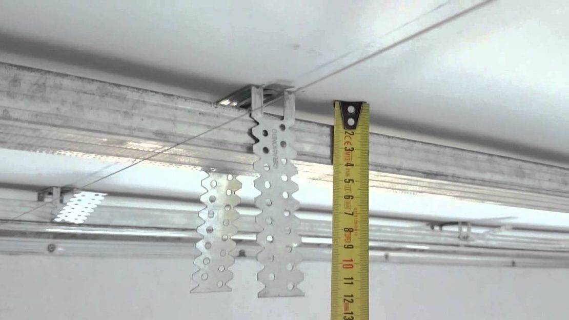 Чтобы ровно закрепить профили, используют гидроуровень. Окончательный монтаж каркаса своими руками требует усиление его в определенных местах. К ним относят те, где будет выполнен монтаж вентиляционных элементов, источников освещения, коммуникации или люстр.