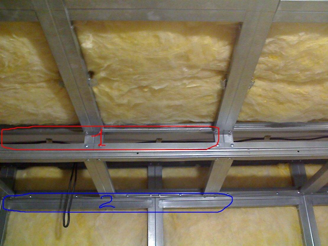 Теперь следует закрепить потолочные профили к установленным подвесам, начиная от угла комнаты. Каркас готов, можно выложить утеплитель и собрать потолок из листов.