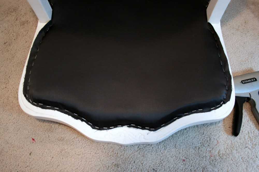 Для перетяжки кресла или барного стула рекомендуется использовать натуральную кожу или плотный текстиль. Крепить материал к основанию лучше с помощью строительного степлера или клея. Процесс займёт не более 15–20 минут (при определённом навыке).