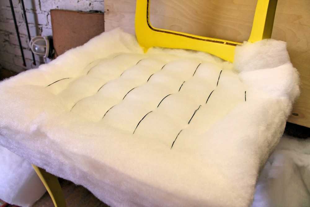 Поверх поролона укладывается синтепон. Его толщина небольшая — 1 см в свободном состоянии или около того. Проще ориентироваться по плотности: 150-200 г/м². Этот слой нужен для того, чтобы меньше терся поролон/ППУ/латекс. Так отреставрированная мягкая мебель будет служить дольше.