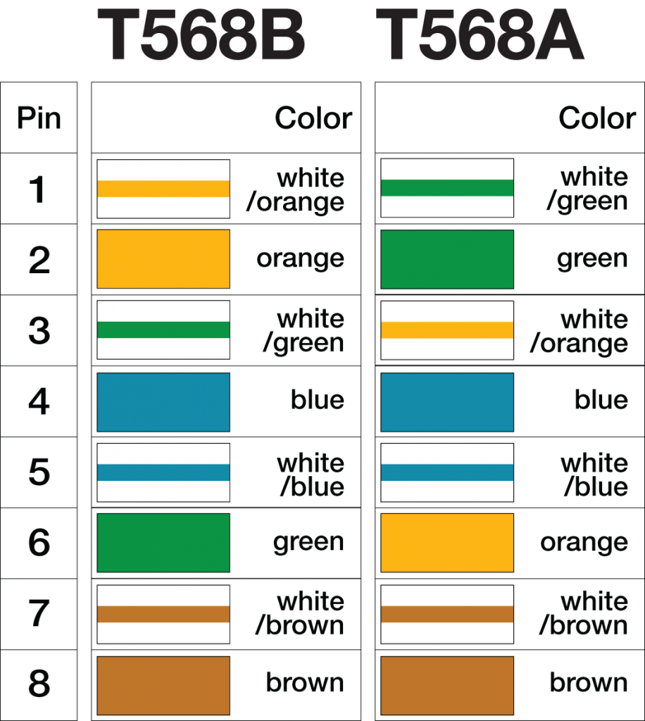 Стандарт TIA / EIA 568-A, который был ратифицирован в 1995 году, был заменен стандартом TIA / EIA 568-B в 2002 году и с тех пор обновлен. Оба стандарта определяют выходы T-568A и T-568B для использования кабеля с не экранированной витой парой и разъемов RJ-45 для подключения Ethernet. Оба стандарта T-568A и T-568B являются наиболее часто используемыми в Ethernet-соединений. Приставка RJ означает Зарегистрированные Jacks. RJ-11 представляет собой 6-позиционное 4-жильное гнездо, используемое для телефонной проводки, а RJ-45 — 8-позиционное 8-жильное гнездо, используемое в 10BaseT и 100BaseT ethernet-проводке.