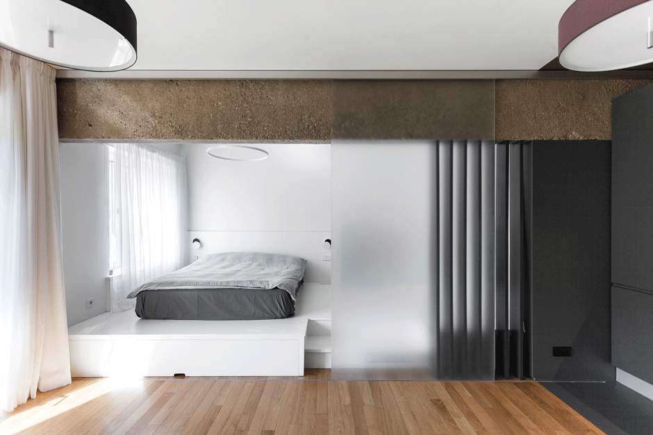 Фото: Можно легко скрывать кровать в небольшой квартире с помощью матового стекла