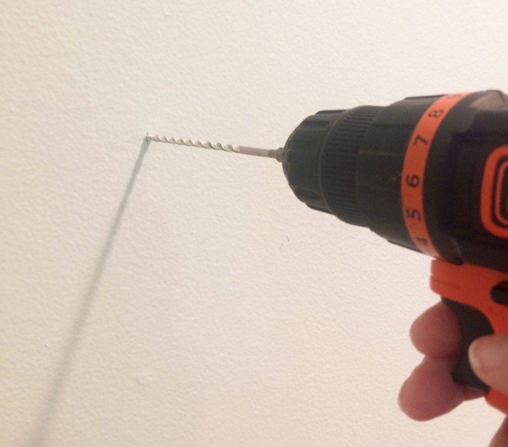 - Просверлить в необходимом участке стены отверстие, сквозь ГКЛ и профиль, на который он крепится.