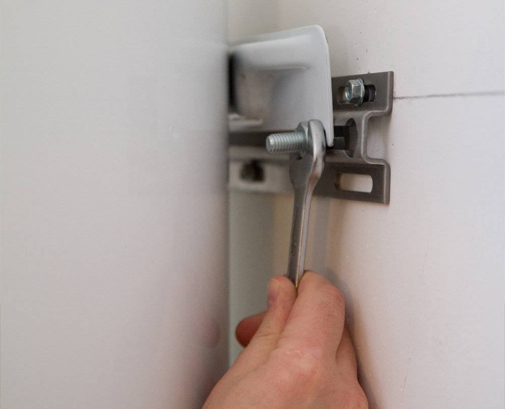 Последний этап крепежа потребует небольших усилий. Учитывается, что монтируемый предмет должен удерживаться до полного вкручивания всех винтов. По возможности установку осуществляют непосредственно через заднюю стенку шкафчика, если для этого имеется специальная закладная.