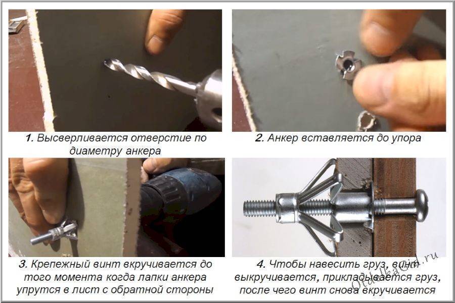 Такие крепежи могут быть различных видов, но одним из их преимуществ является, то, что при закручивании в стену они начинают раскрываться, образовывая тем самым достаточный упор и принимая на себя значительную часть нагрузки. Для закрепления таких полок потребуется особая конструкция, во-первых, потребуется монтировать конструкцию строго в профиль гипсокартонного листа, во-вторых, использование особых креплений.