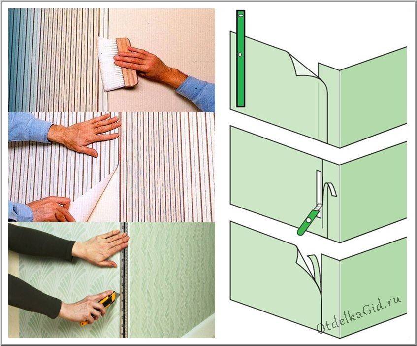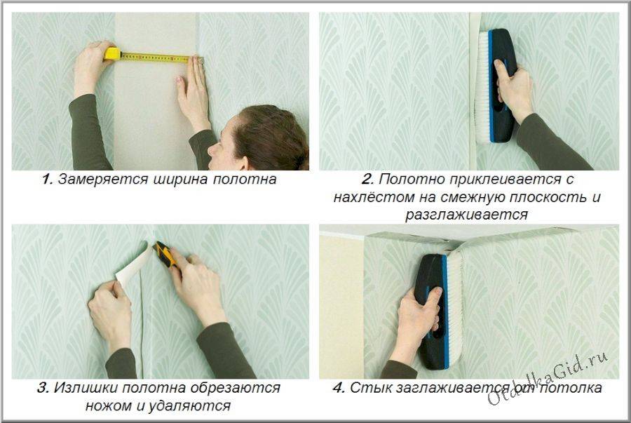 Такая технология позволяет клеить разные виды изделий, но если угол не предполагает подрезку, укладка осуществляется стандартным образом. Для этого стык обеих сторон выполняется с запасом, чтобы нивелировать неровность путем подгонки и обрезки по месту совмещения. Это займет больше времени, но позволит избавиться от наложения в углу.