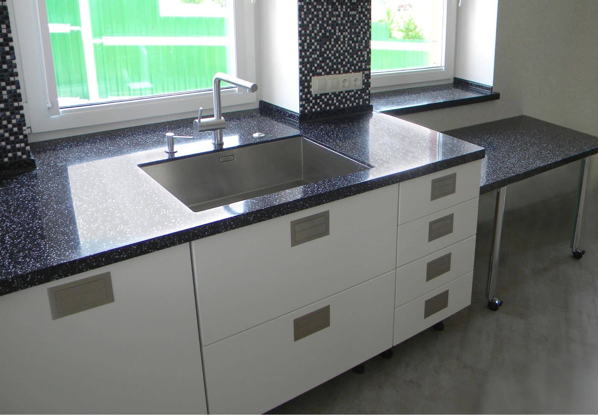 Из недостатков можно определить высокую стоимость, большой вес, а также сложность обработки. В качестве альтернативы натуральному камню можно сделать выбор в пользу аналога искусственного происхождения, для изготовления которого обычно используют особые материалы. Со столешницей, которая выполнена из камня искусственного происхождения, можно и вовсе не бояться за то, что вы нанесете разного рода механические повреждения, разольете на поверхность жидкости (виной, чай или кофе), можно даже ставить горячую посуду. Несмотря на то, что стоимость высока по сравнению с остальными материалами, также есть возможность выбора более доступных вариантов.