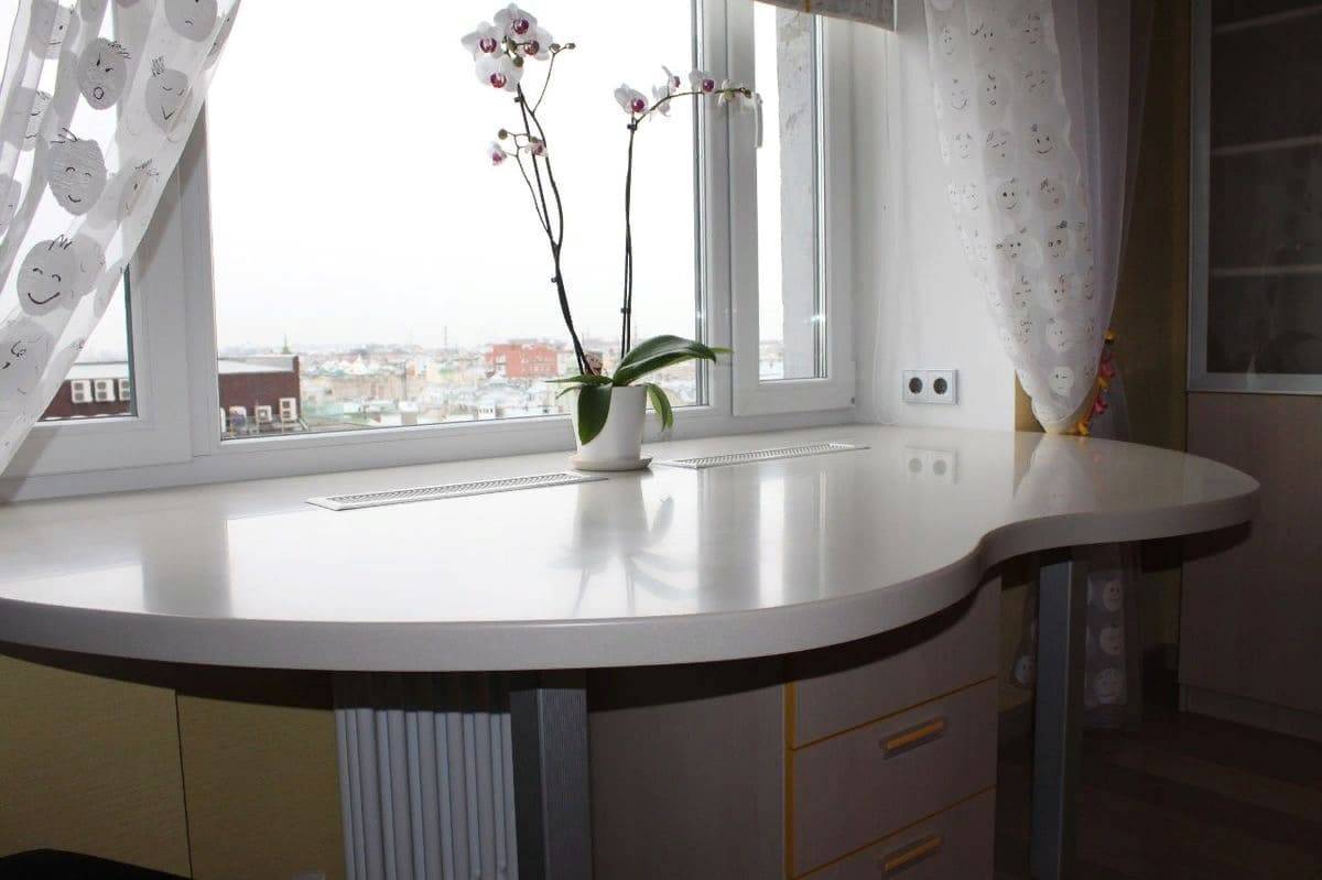 - Высота конструкции определяется высотой оконного проема над уровнем пола. Чтобы поднять или опустить подоконник, придется сдвигать окно. А это либо очень проблематично, либо вовсе невозможно. Возможности регулировки высоты толщиной столешницы минимальны.
