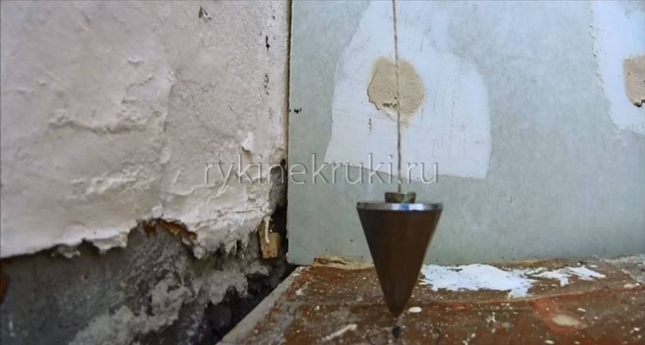 Переходим на другой край этой стены. И в такой же последовательности выполняем те же действия: отмечаем на потолке 5 см от стены, опускаем отвес к полу, останавливаем грузик, чтобы он не качался и под кончиком грузика аккуратно ставим точку.