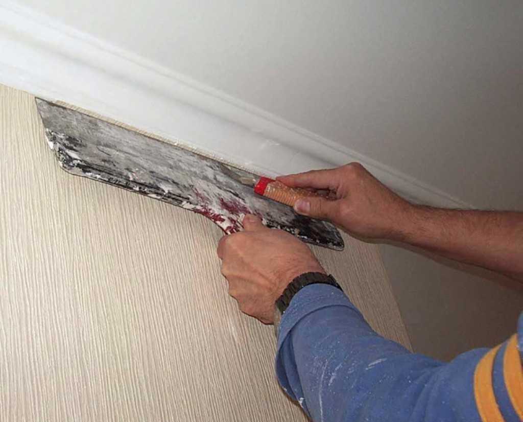 Чтобы его приклеить, надо наносить точки на приклеиваемые грани шагом в 1-2 см. Если, при приклеивании потолочного плинтуса, выдавилась мастика – её можно удалить лезвием после того, как она затвердела. Обычно потолочный плинтус клеится до поклейки обоев на стены и потолок. Это связанно с тем, чтобы после демонтажа обоев (когда вы снова затеете ремонт) он не оторвался вместе с обоями. Обои подрезаются под ним с помощью шпателя и канцелярского ножа.