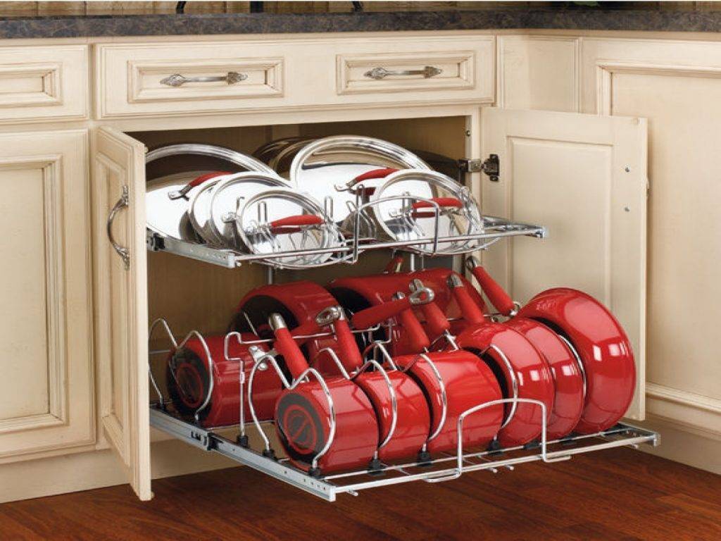 И напоследок, идея для хранения крупной утвари: кастрюль, сковородок, пароварок и т.п. Использование таких вот полок существенно упростит доступ к большим и тяжелым кастрюлям.