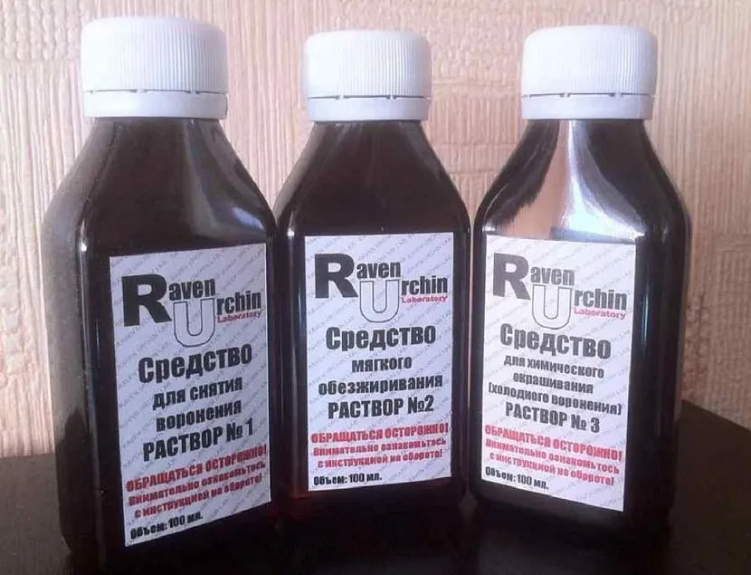 Воронение используют на тех металлах, которые в будущем не станут окрашивать. Для химических процессов по горячей технологии нужен специальный раствор. В 1 л воды добавляют 280 г фосфорной кислоты и 15 г – винной. Полученную жидкость наносят кистью на очищенную и отполированную поверхность буржуйки. Избыток вещества смывают хозяйственным мылом.