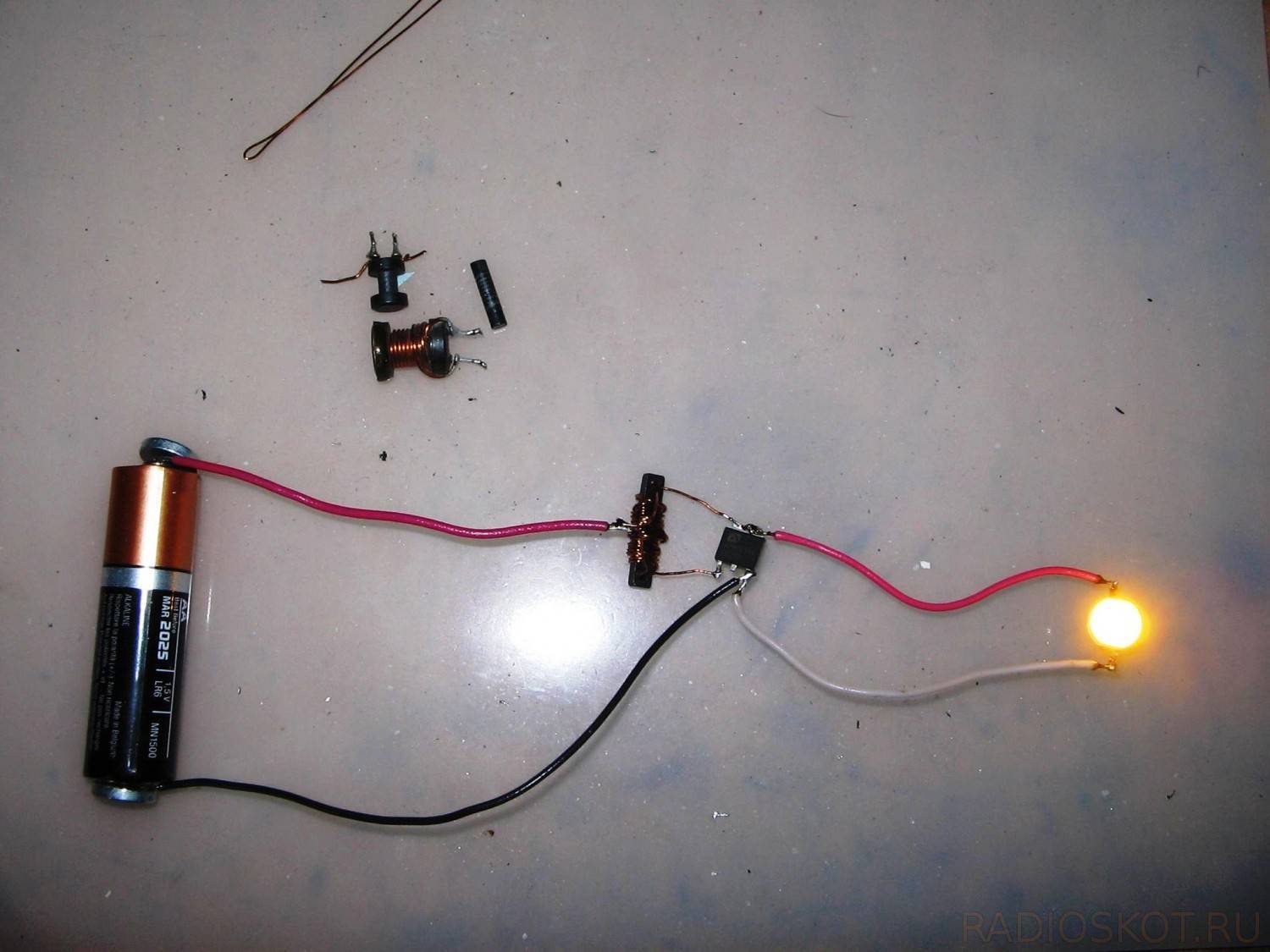 Повышающий автотрансформатор поможет преобразовать низкие спонтанные импульсы от первичной катушки в достаточное напряжение для работы светодиода за счет самоиндукции коллекторной обмотки. Так как она связана с базовой обмоткой, постоянный и стабильный электрический ток будет подаваться на суперконденсатор в достаточном количестве. Резистор же ограничит превышение допустимых номиналов. Конденсатор достаточной емкости также подобран автором опытным путем с помощью замеров исходящих сигналов осциллографом.