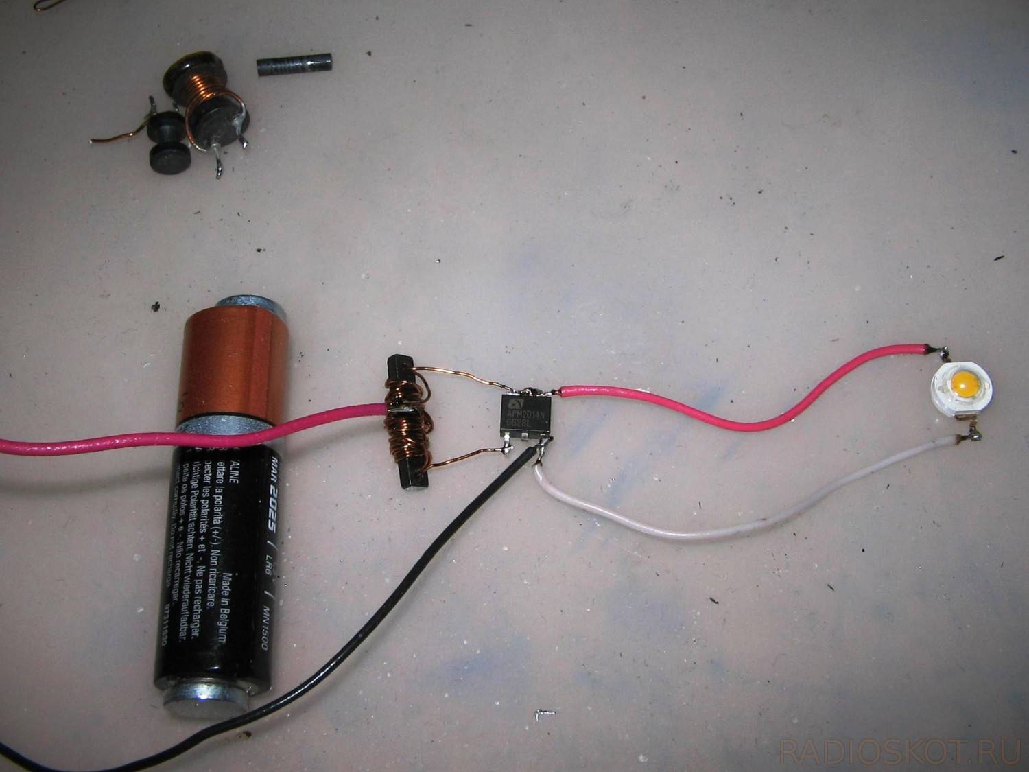 Последние манипуляции. Осталось подключить к практически готовому фонарику выпрямитель, резистор и автотрансформатор. Места их расположения показаны на схеме сверху. Ёмкость конденсатора также придётся устанавливать опытным методом. На замыкании схемы нужно установить биполярный транзистор. Последние 2 манипуляции сводятся к установке выключателя на любой контакт и пайке светодиода.