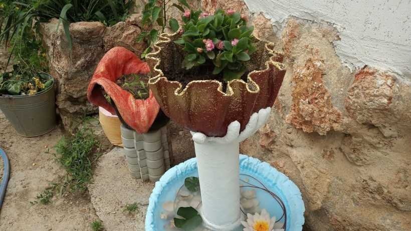- Пластиковых контейнеров. Контейнер заворачивают в целлофановый пакет. Внутрь кладут пакет с песком для поддержания формы. Внешнюю сторону покрывают цементом. Дают высохнуть, после чего пакет с песком удаляют, в дне просверливают несколько отверстий для лучшего дренажа. Поделку грунтуют, красят. В контейнеры можно высаживать кактусы.