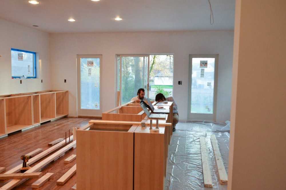 - Распил. Зазоры для сборки закладываются на кромку, глубину полок, фасады ящиков, задник и высоту цокольной части. Каждая деталь, распиленная по размерам, подписывается и нумеруется. Это ускорит сборку.