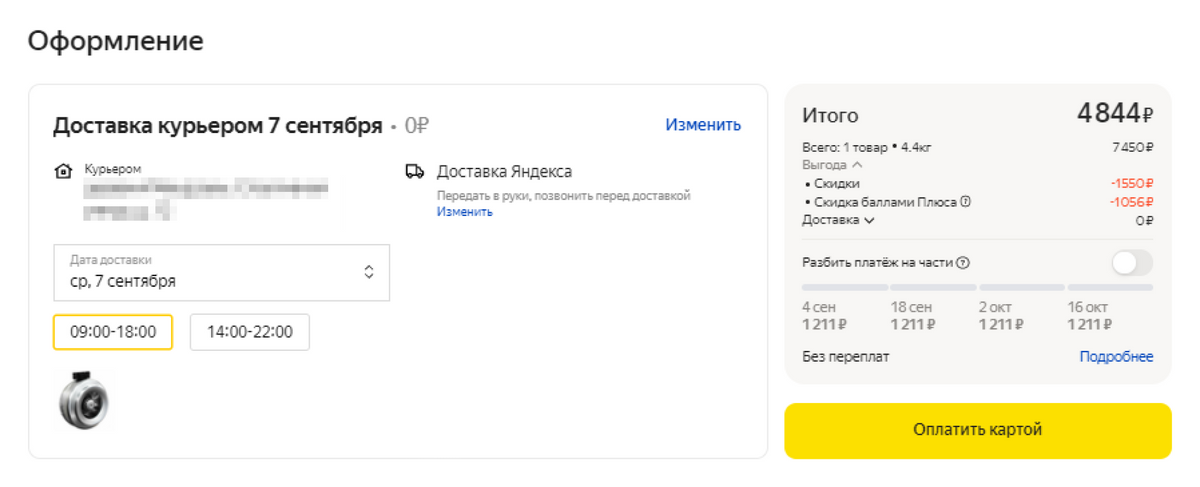 При подписке на «Яндекс-плюс» заказ мне доставили бесплатно. К тому же я выбрал товар со скидкой в 1550 Р и еще 1056 Р мог списать баллами