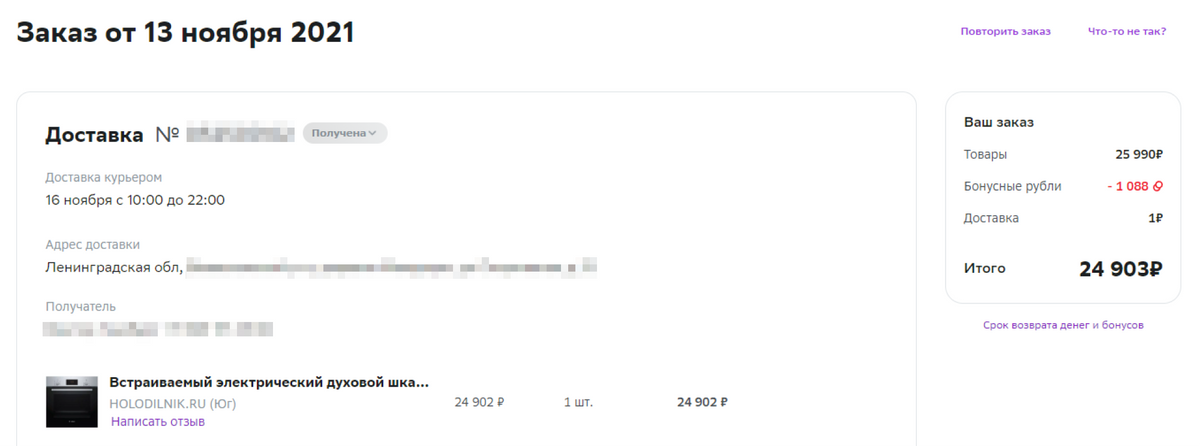 На «Сбер-мегамаркете» я покупал встраиваемую духовку Bosch и списал баллами 1088 Р, которые мне начислили за предыдущую покупку