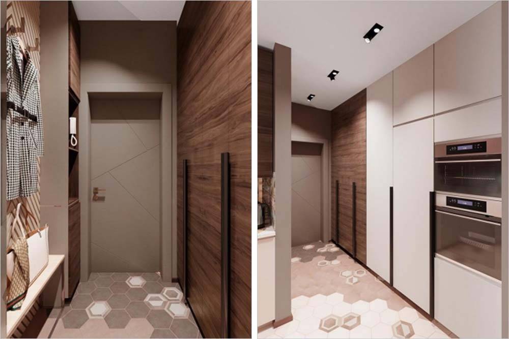 Это 3D-визуализация прихожей. По факту она получилась максимально похожа на проект, отличается только цветом входной двери