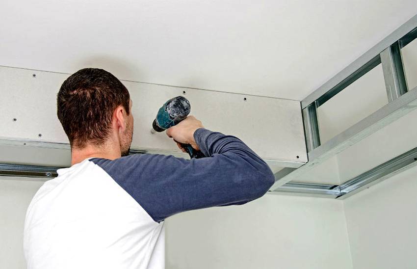 - После этого заготовки из гипсокартона фиксируют на направляющих каркаса с помощью саморезов и шуруповерта.