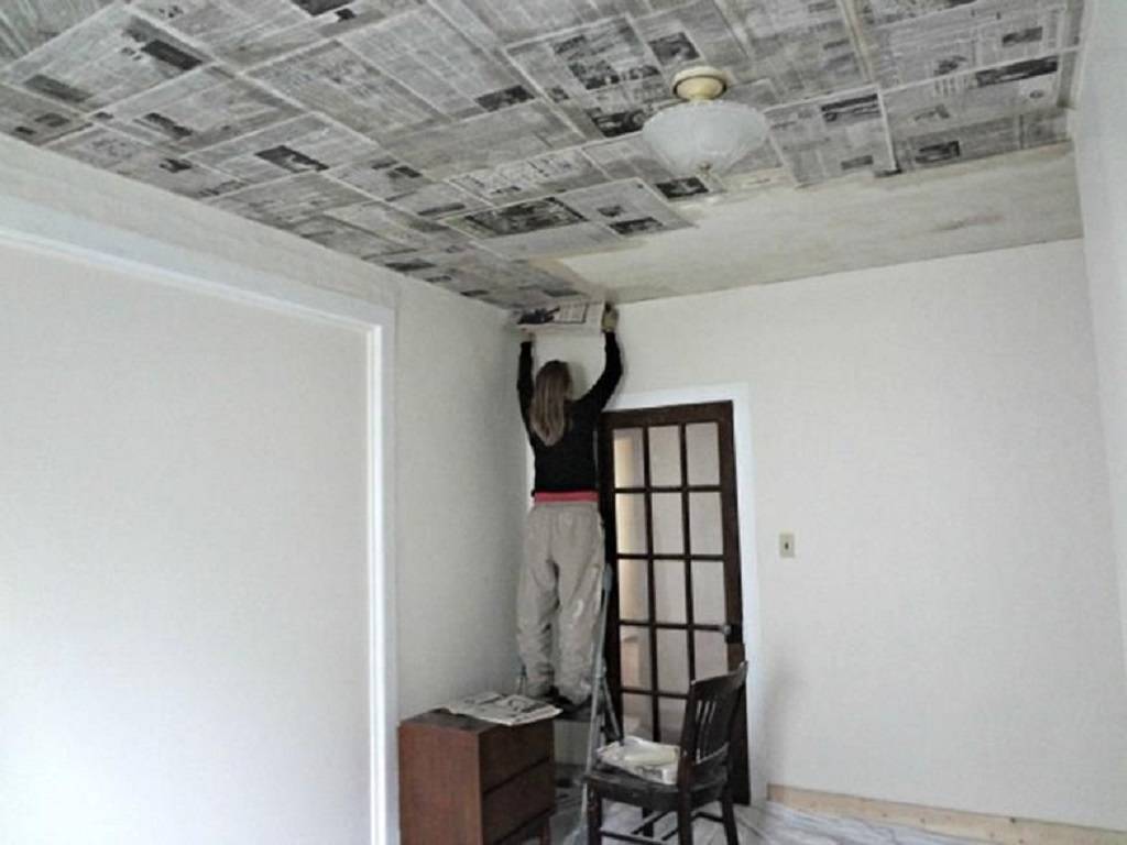 «Приклеиваем» старую побелку. Очень необычный и, наверное, поэтому не такой популярный способ. Чтобы его осуществить, вам понадобятся старые газеты (много старых газет) и дешевый клей. С его помощью бумажные листы приклеиваем к побелке, оставляя один край газеты свободно свисающим. Затем следует дождаться подсыхания клея, после чего бумага просто срывается. Как результат – потолок свеж и чист без использования воды, а количество грязи в комнате после такой процедуры минимально. После завершения работ потолок отмывают от остатков клея и продолжают ремонт.