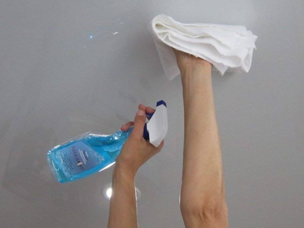 - Намочить губку в растворе, протирать потолок до полного смывания мела с основания. Работать следует аккуратно, чтобы капли не начали стекать по руке, капать на пол, голову или одежду.