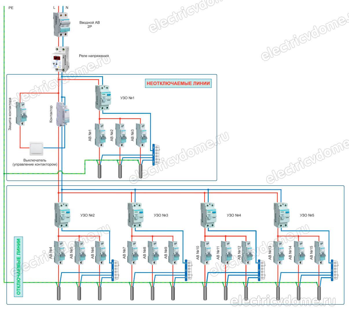 При таком варианте схемы установка УЗО производится после вводного автоматического выключателя и ещё на каждую отходящую линию.