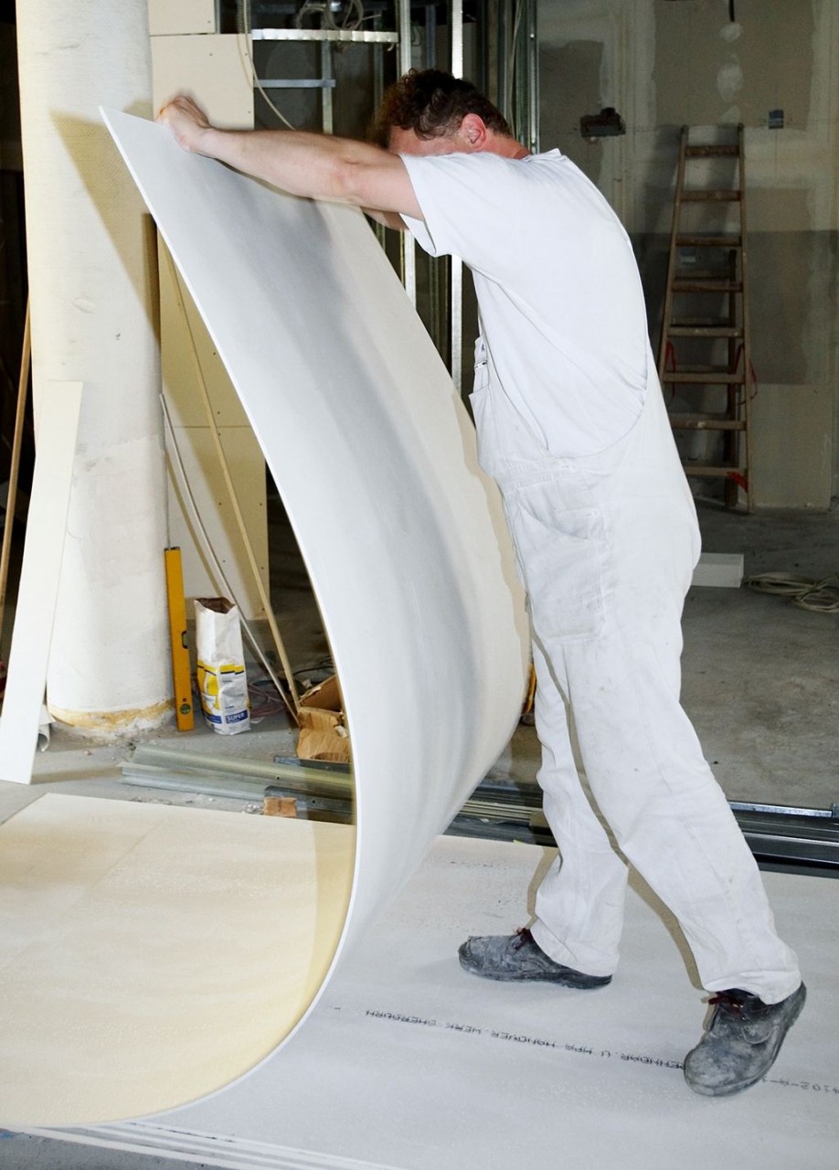 Гипсокартон, это своего рода сэндвич из картона по краям и гипсовой плиты посередине, что способствует легкому сгибанию. Гипс, очень податливый и «мобильный» материал, которому придает прочности толстый картон