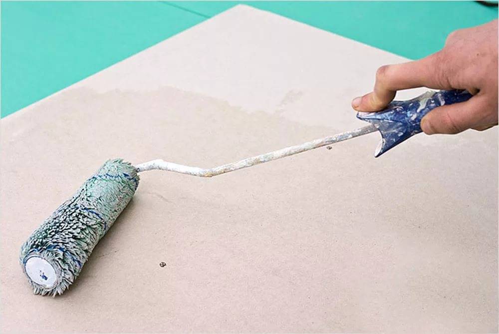 3-й шаг. Используя обычный покрасочный валик, ГКЛ начинают смачивать до того момента, пока вода не перестанет впитываться в поверхность.
