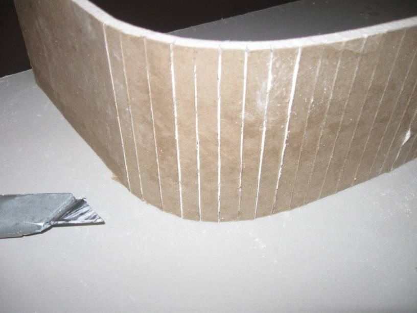 Когда нет фрезы и игольчатого валика, не стоит отчаиваться, можно согнуть гипсокартон при помощи простого . Желательно, чтобы лезвие было толстое, тогда можно будет сделать ровный полукруг из полосы гипсокартона.